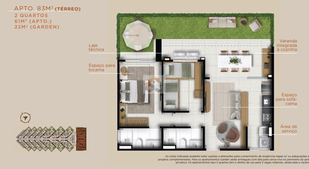 Apartamentos pensados em cada detalhe para o seu conforto, espaço e aconchego, os apartamentos de 2 quartos te dão o direito de usar DUAS vagas de garagem!